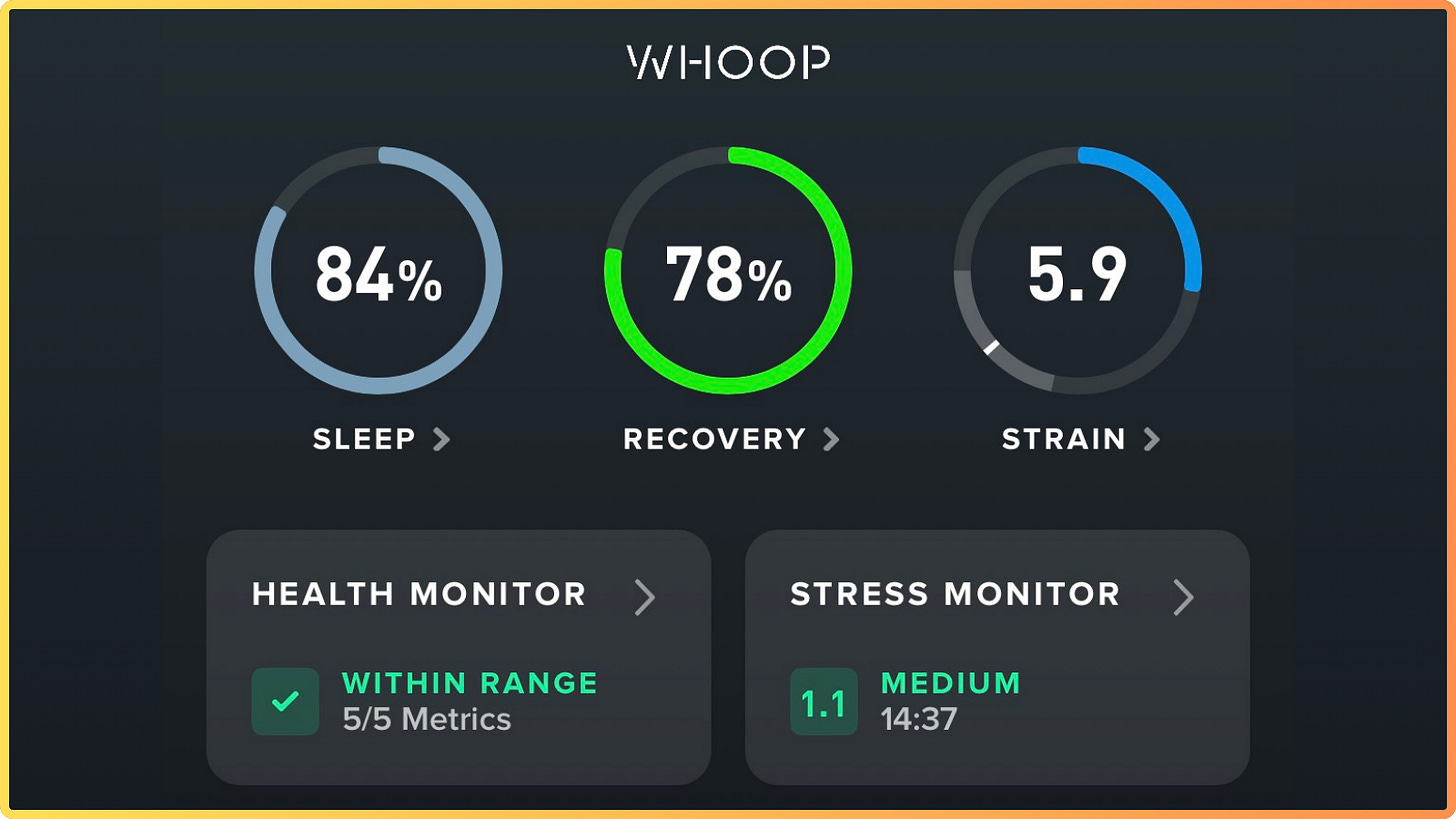 Whoop provides feedback by measuring three areas of health: sleep, recovery, and strain. It displays this data, similar to Apple, in a ring layout.